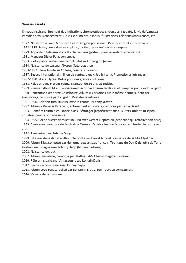 Nous avons réutilisé cette activité plusieurs fois et, pour la diversifier ou pour la rendre différemment attractive, nous avons constitué de nouvelles listes d’étapes de vie à partir de la biographie de figures célèbres comme Zinédine Zidane, Vanessa Paradis, Romain Duris… On peut ainsi mobiliser différentes sources d’écriture : logique, explications psychologiques, inspiration, descriptions, connaissances encyclopédiques… En tant qu’activité d’écriture complexe et souple, elle permet de faire travailler toute personne quel que soit son niveau, aussi bien en entraînement qu’en évaluation.