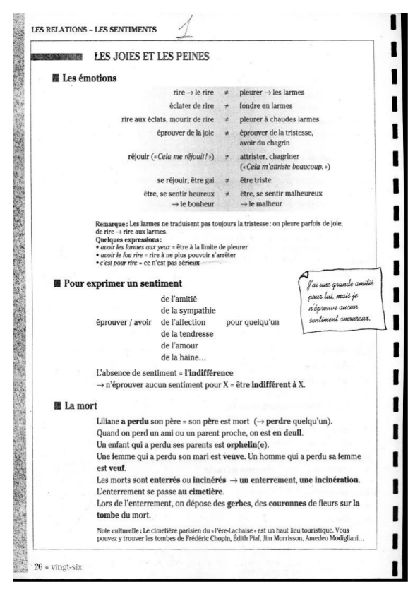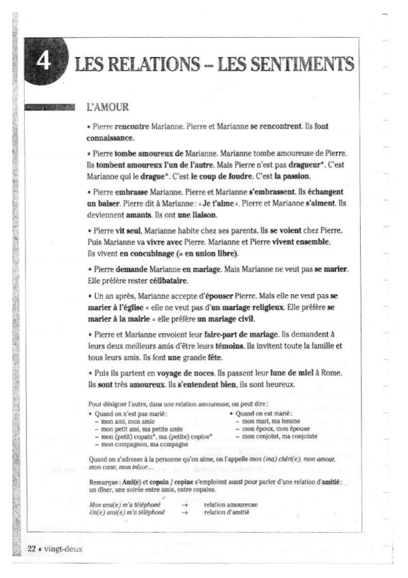 - vocabulaire des sentiments, envies, verbes de la rencontre amoureuse…