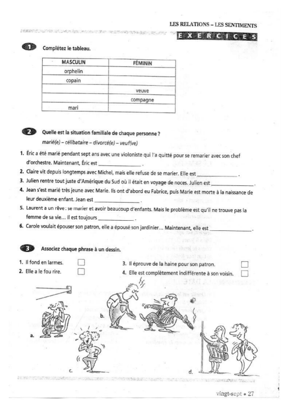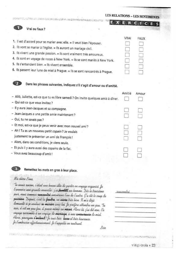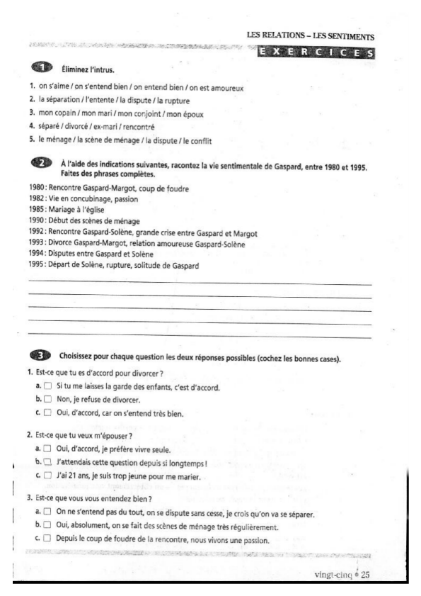 Dans cette activité, après une présentation et des exercices sur un vocabulaire spécifique, il est demandé de raconter une histoire à partir d’une liste de dates et événements associés (exercice 2 de la page 25, ici 4e image). Cette activité de production écrite est très efficace – en dehors du fait qu’il soit question de raconter la vie sentimentale comme dans le résumé d’un mélodrame – notamment parce qu’elle permet un réinvestissement de nombreuses éléments (manipulation des temps du passé, des outils d’organisation du récit, gestion des reprises anaphoriques…), et un enrichissement du texte infini pour tout apprenant à l’aise avec les éléments de base demandés.