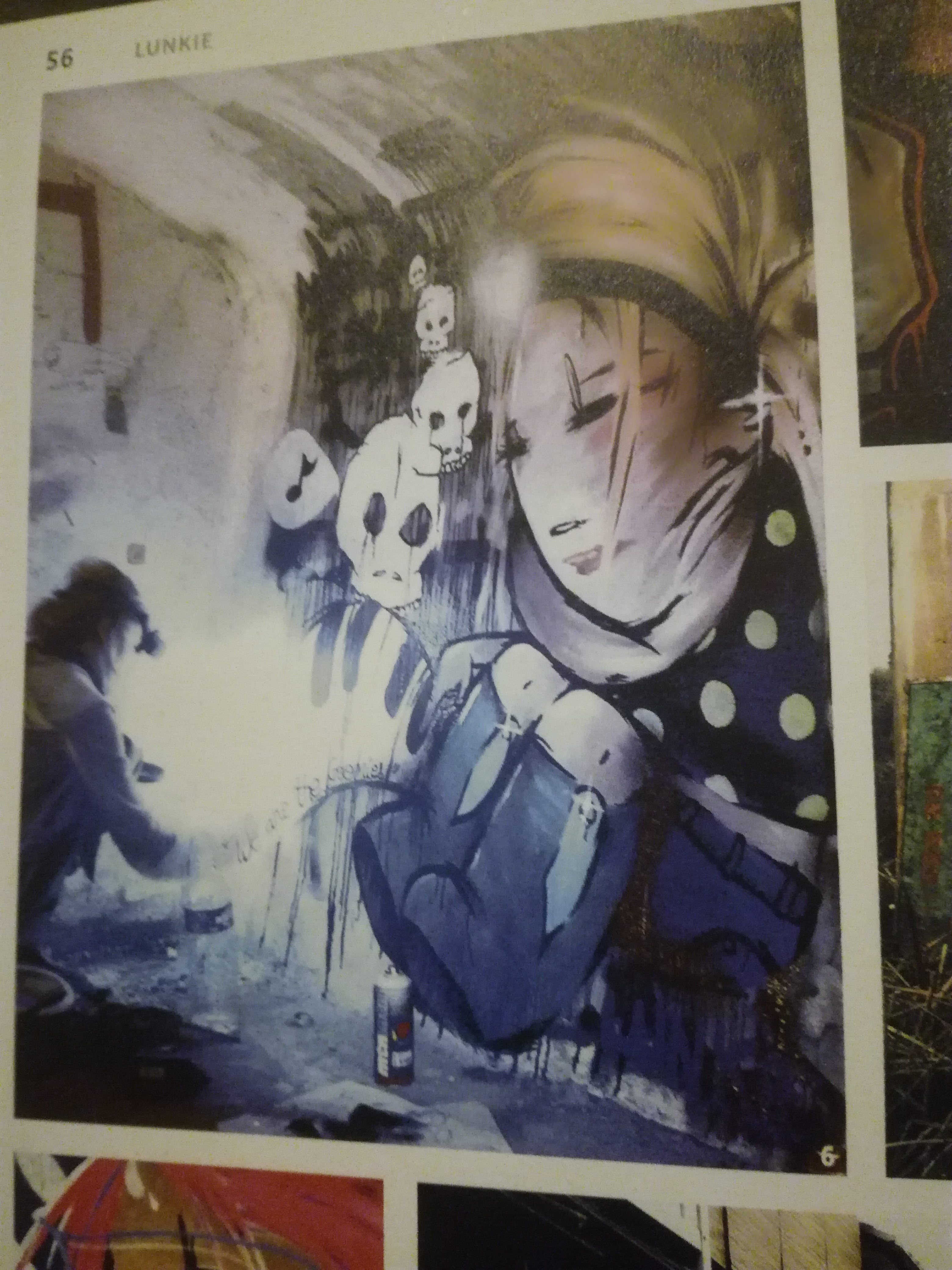 Pour l’univers du graffiti, le lettrage (comme le verbe biblique) est premier. Les dessins figuratifs sont donc en général une sorte d’accompagnement. Le choix des deux auteures (après une première publication orientée lettrages) d’axer l’ouvrage sur ces pratiques figuratives, c’est la volonté d’accorder une nouvelle importance à cette pratique seconde (parallèle à l’ambition de mettre la femme et l’homme graffeuse graffeur sur un pied d’égalité ?). Les graffeuses ici présentées rappellent qu’elles sont confrontées à deux difficultés : le fait de faire des figures considérées comme plus conventionnelles ou faciles d’accès (comme des chansons pop) dans un monde de lettres (art abstrait, free jazz), et d’être des femmes dans un univers plutôt masculin. La première difficulté se résout d’elle-même : la figure est non seulement nécessaire au lettrage, complément donnant de la légèreté, du mouvement, de la fantaisie, mais elle est comme une double-porte d’accès – comme le dieu Janus – pour accéder à ce monde secret pour les non-initiés (les lettrages étant souvent plus hermétiques) mais aussi pour les graffeurs pour en sortir et se rendre dans le monde conventionnel de l’art reconnu, rémunéré, de l’art appliqué… La figure complétant un éventuel book en montrant des compétences de dessin traditionnel, d’illustration. Les figures représentent également une plus grande interaction avec le spectateur. Il y a avant tout un regard, une moue, un mouvement, dans chacun de ces personnages. Du personnage convivial riant parmi ses lettres, comme un partenaire de jeu ou de rêve, à la femme qui séduit, libérant tout son charme ou qui au contraire marque son mécontentement par son regard, par un cri… en passant par le personnage acteur du mouvement, qui danse, qui vit dans l’univers urbain de la rue, des banlieues, du hip-hop… presque un personnage de bande dessinée. L’influence du monde des BD, comics ou mangas est flagrante. Les murs blancs, longs comme des bandes, se prêtent très bien à cette lecture, à ce mouvement, cette action qui se déploie, de gauche à droite (tout comme la disposition des photos), réconciliant dessin et écriture, signifiant et signifié. Les lettres sont souvent présentes pour leur formes, leurs mouvements et couleurs (non plus pour leur signification), les dessins portent davantage de sens (inversant le rapport habituel). Bref, les figures font parler les murs, sont-ce les voix des sans-voix ? les exclues et les emmurées ? Ces femmes qui étaient cachées sortent des murs. La vie de la pierre, trait tellement évident pour cette culture urbaine, née des bas-quartiers où les hommes et femmes sont justement si souvent réduits et réduites aux pierres et aux murs qu’ils habitent (attachement à leur résidence définie par l’unité esthétique des bâtiments, jeunes qui tiennent les tours en s’adossant, cœur de pierre, vie dans les caves, femmes discrètes voire emmurées…).