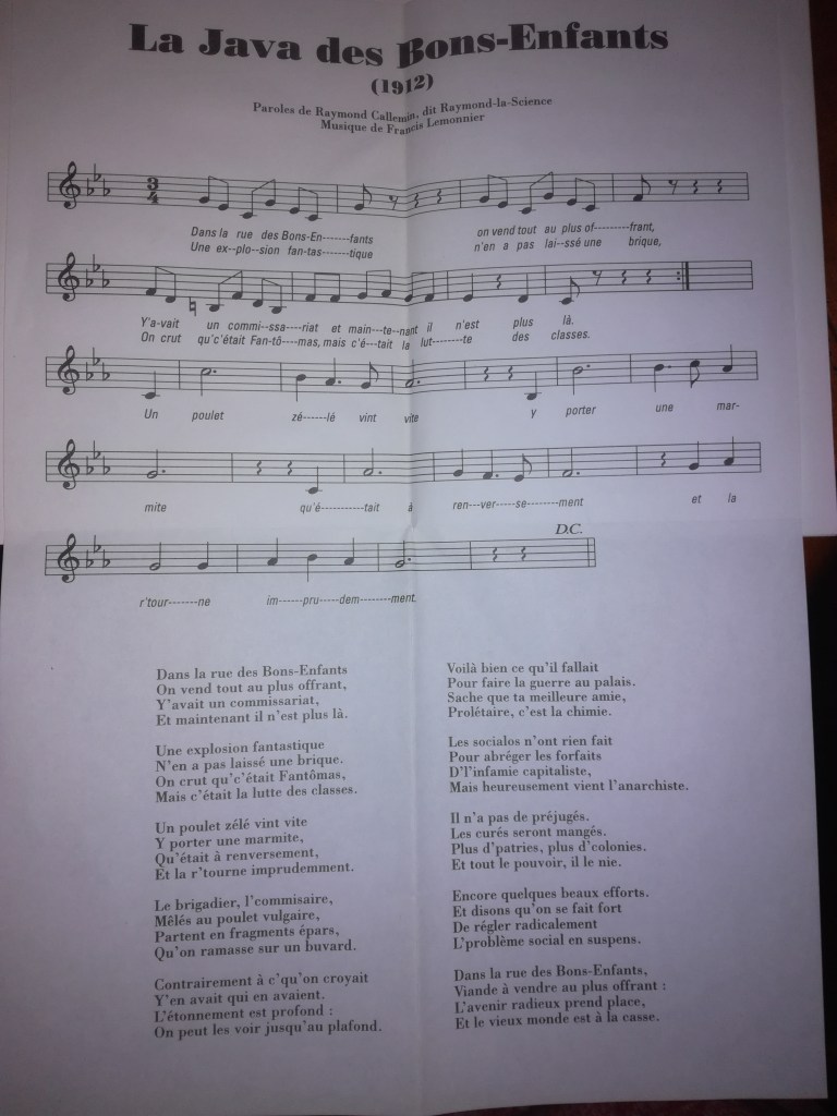 Cette édition par le Ravin bleu inclut le texte et la partition de « La Java des Bons-Enfants », chanson racontant l’acte terroriste de Émile Henry sur un mode comique, écrite par Guy Debord en 1974 (et prétendument attribuée à Raymond Callemin en 1912, dit Raymond-la-Science de la Bande à Bonnot) sur une musique de Francis Lemonnier.