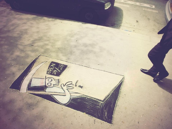 Son travail vivra jusqu’à la prochaine pluie, jusqu’au prochain rouleau, jusqu’à la prochaine idée, devant un musée, entre les tables pourries d’un atelier de banlieue, sur le mur d’une ferme. La boulangère en discute avec le représentant de commerce qui cherche son chemin. Ce soir là à s’endormir avant minuit, un choux-fleur au bout de la fourchette, demain à l’aéroport marchant comme un lundi six toiles enroulées sous l’aisselle. Il y aura bientôt un tableau de lui dans la galerie d’une grande ville de province suédoise, deux aquarelles dans un pub bien cool d’une ville de montagne au Chili, ou sinon au moins dans un bar PMU du Vercors. Un dimanche, marche avec quelques anonymes qui parlent d’art et de mots, lui sortira de sa poche une grosse boîte de craies, ou une tablette de chocolat.