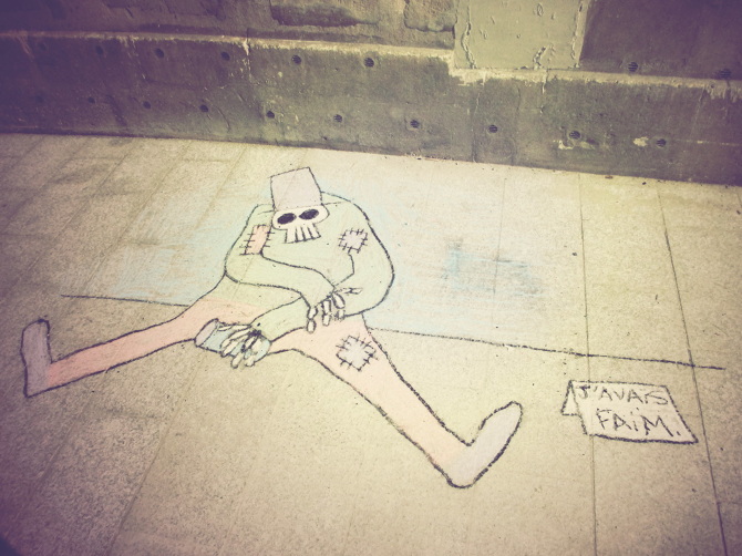 Bien-sûr, il y en a aussi d’autres des artistes… mais moins folichons. Ils ressemblent à monsieur untel. Ils vivent une vie de simple mortel, dans un appartement encombré, au bout d’une ligne de TER. Ils écoutent – ils, car ils essaient de vivre en couple, peut-être même d’avoir une famille, si une année est plus clémente –, ils écoutent, disions-nous, le chant d’un sans-abris mais avec-bouteille, l’haleine heureuse sous leur fenêtre. Chacun ses mondanités. Où peint notre artiste de la vie ordinaire ? Dans la chambre ? qui est aussi le salon et la cuisine ? dans l’escalier quand le chant de Bacchus ou la sirène de police lui inspire une jetée de peinture. Il peint aussi dehors, sur le mur où a pissé le chanteur, un peu plus loin crayonne sur le trottoir où le chanteur s’est avachi ce matin avant d’être chassé par un marchand.