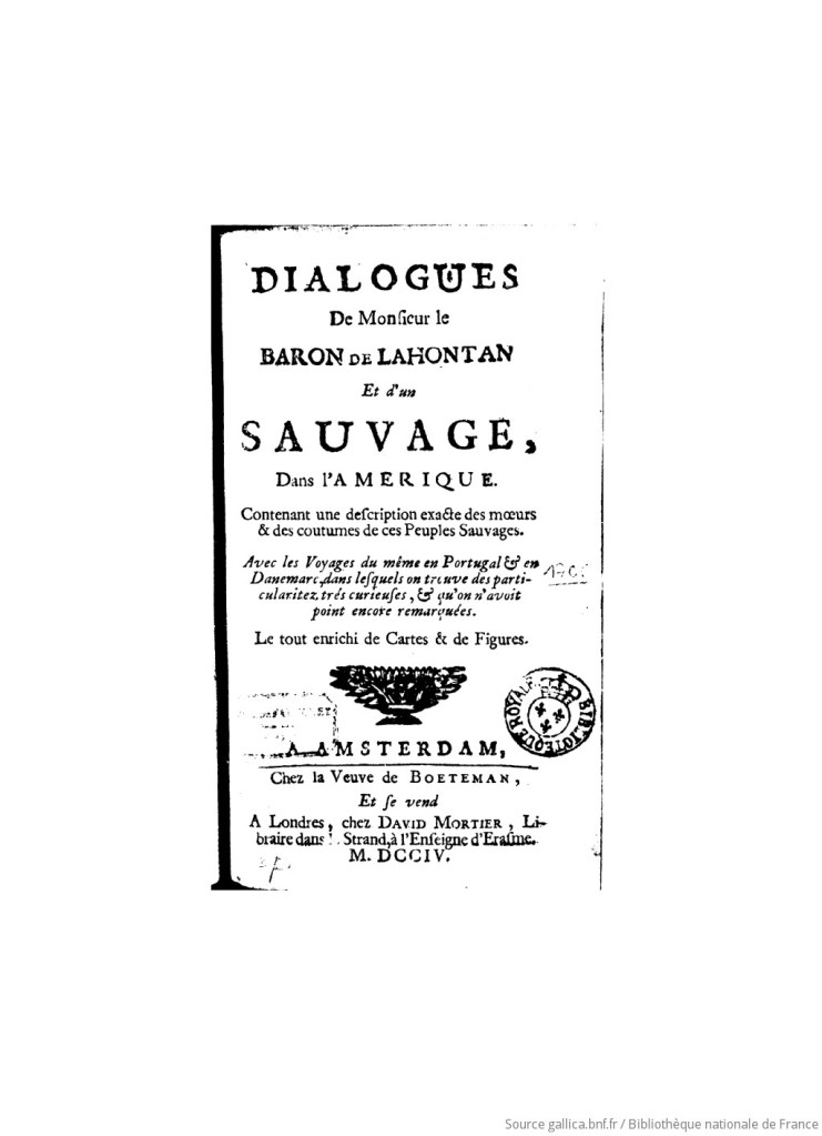 Lahontan (Louis-Armand de Lom d’Arce, dit baron de) 1704, Dialogues de M. le baron de Lahontan et d’un Sauvage dans l’Amérique, Amsterdam, Boeteman.