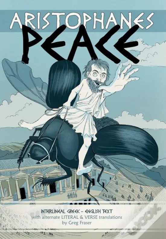 Le bon vigneron Trygée nourrit un coléoptère bousier pour que celui-ci l’emmène en Olympe demander la paix aux dieux. Sur place, il ne trouve qu’Hermès qui l’informe que les dieux ont déménagé, exaspérés par les guerres incessantes des Grecs. Que le palais est occupé uniquement par Polémos qui a emprisonné la déesse de la Paix dans une cave… Avec l’aide des agriculteurs de différentes cités, il la délivre ainsi que deux jeunes filles, Opôra (récolte) avec laquelle il va se marier, et Theôria (spectacle, fête) qu’il rentre offrir à ses compatriotes. Les fabricants d’armes viennent se plaindre…